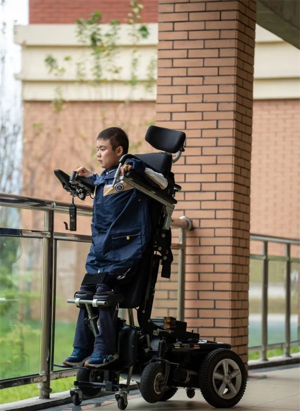 下午三点半的学校教学楼廊道上空无一人,同学们都在操场上体育课。罗睿燊操控着他的“变形金刚”轮椅在宽敞的空地上来回移动、旋转——这是他独特的“体育课”。
