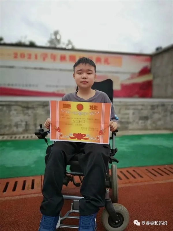 在学校老师和同学的评价里,罗睿燊只是多了一把轮椅,和大家并无区别,是一个自信乐观、坚强勇敢、积极上进,热爱学习的阳光少年。