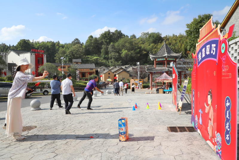 2024年9月28日,游客在安徽省六安市金寨县花石乡大湾村体验套圈游戏。新华网发 (田凯平 摄)